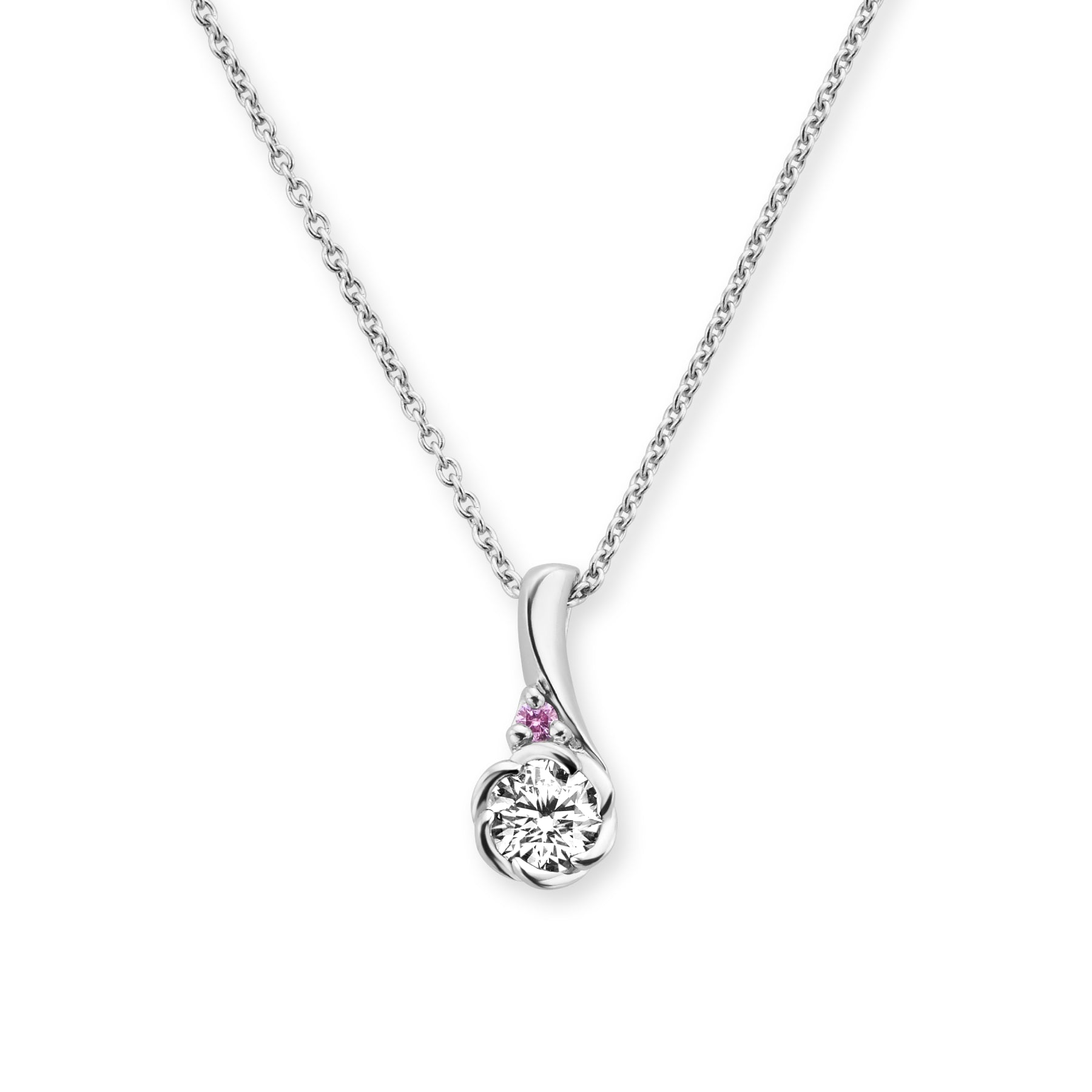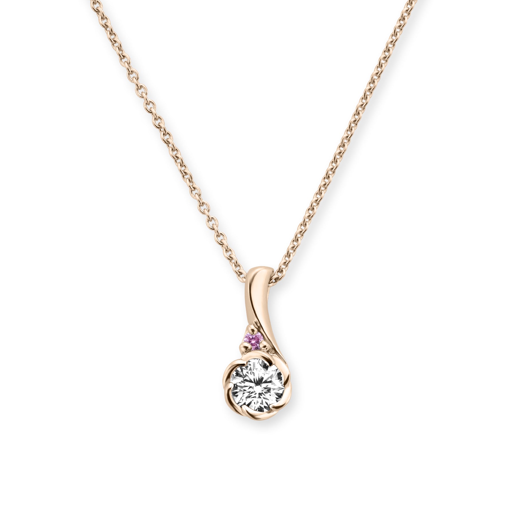 ダイヤモンドを包み込む柔らかな花びらの優しい輝き。さり気ない花に寄り添うピンクサファイアが上品。